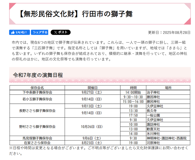 行田市HP【無形民俗文化財】行田市の獅子舞の2025年演舞場所と日にちは、下の行田市のHPをクリック!