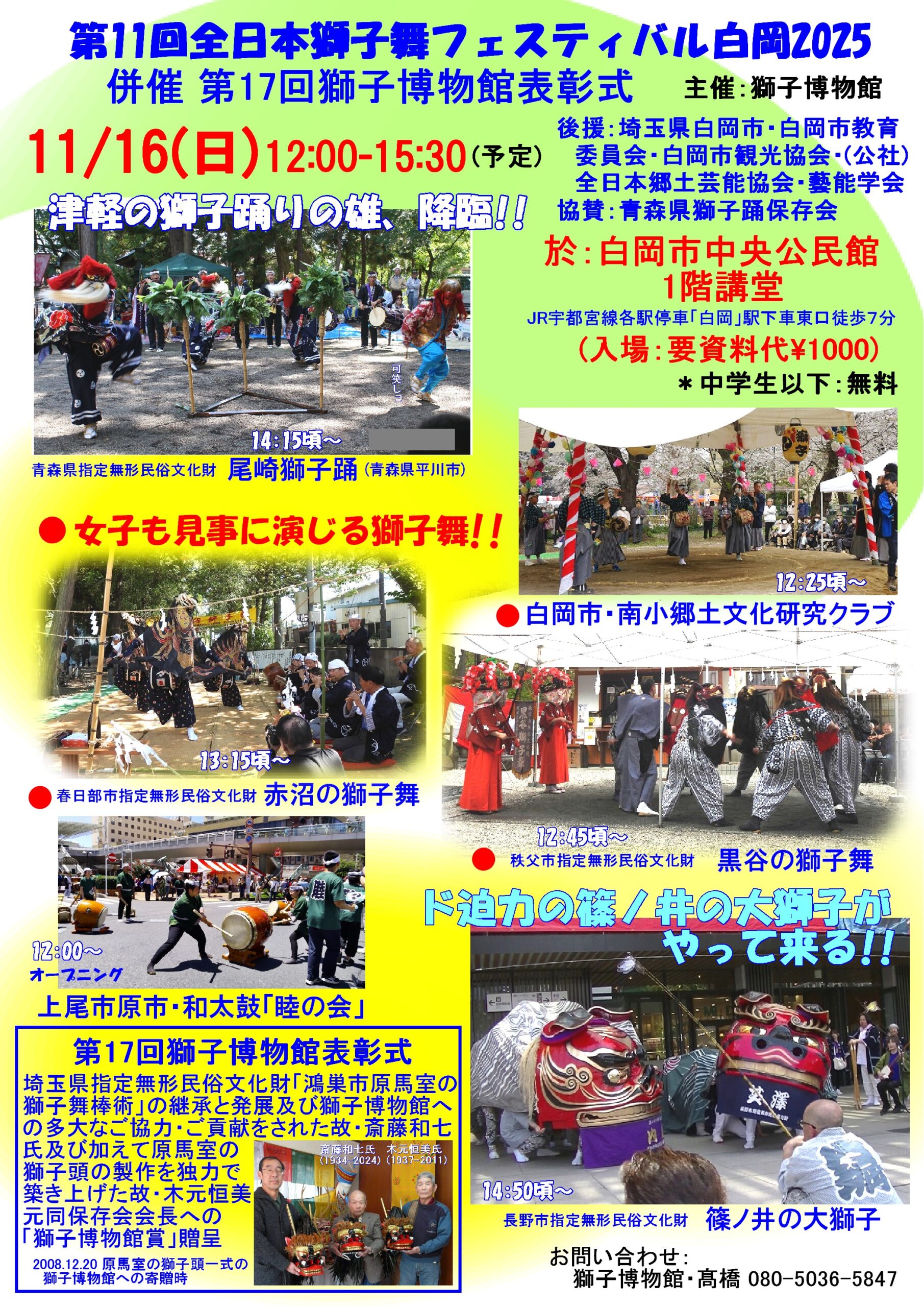 獅子舞に興味をお持ちの方もそうでない方も全国の珍しい獅子舞を見るチャンスです、ぜひ白岡市中央公民館へお出かけください。