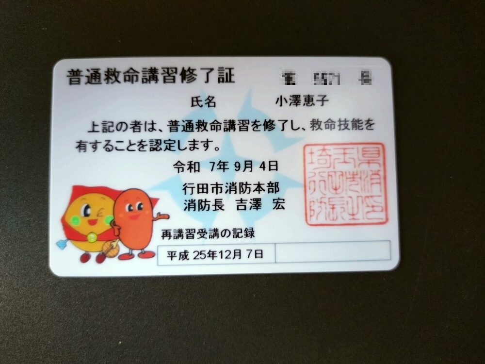 2025年9月6日 / 最終更新日時 : 2025年9月8日 小澤恵子 市民大学投稿 普通救命講習受講 9月4日(木)行田消防署において、普通救命講習を「福祉・健康グループ」7名で受講しました。 1.心肺蘇生法が一人で行える 2.AED(自動体外式除細動器)を理解し、安全に使用することができる 3.気道異物除去法を行える 4.止血法を行える を到達目標として、座学と実技を行いました。 心肺蘇生(胸骨圧迫) おもに救命処置の方法として、心肺蘇生とAEDの使用方法を学びました。 最後に修了証をいただきました。 皆様も受講してみてはいかがでしょうか。 Follow me!
