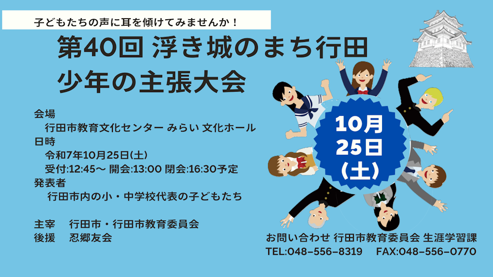 子どもたちの声に耳を傾けてみませんか?第40回 浮き城のまち行田 少年の主張大会10月25日