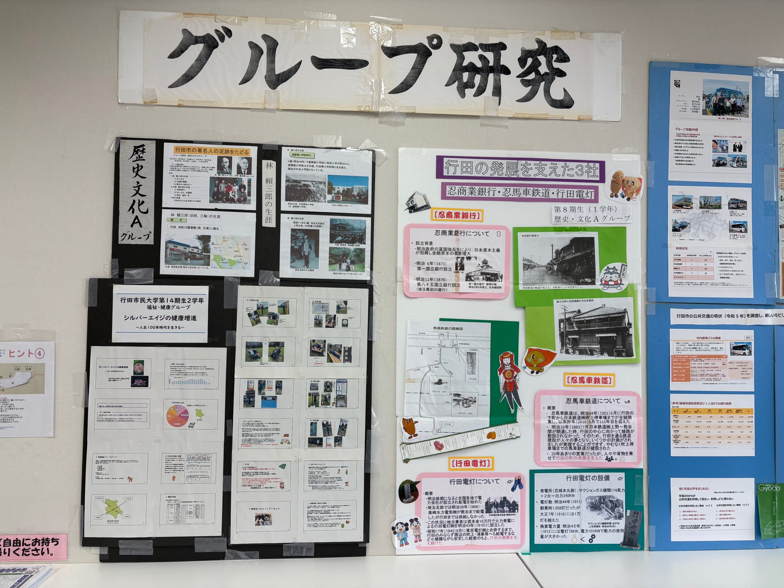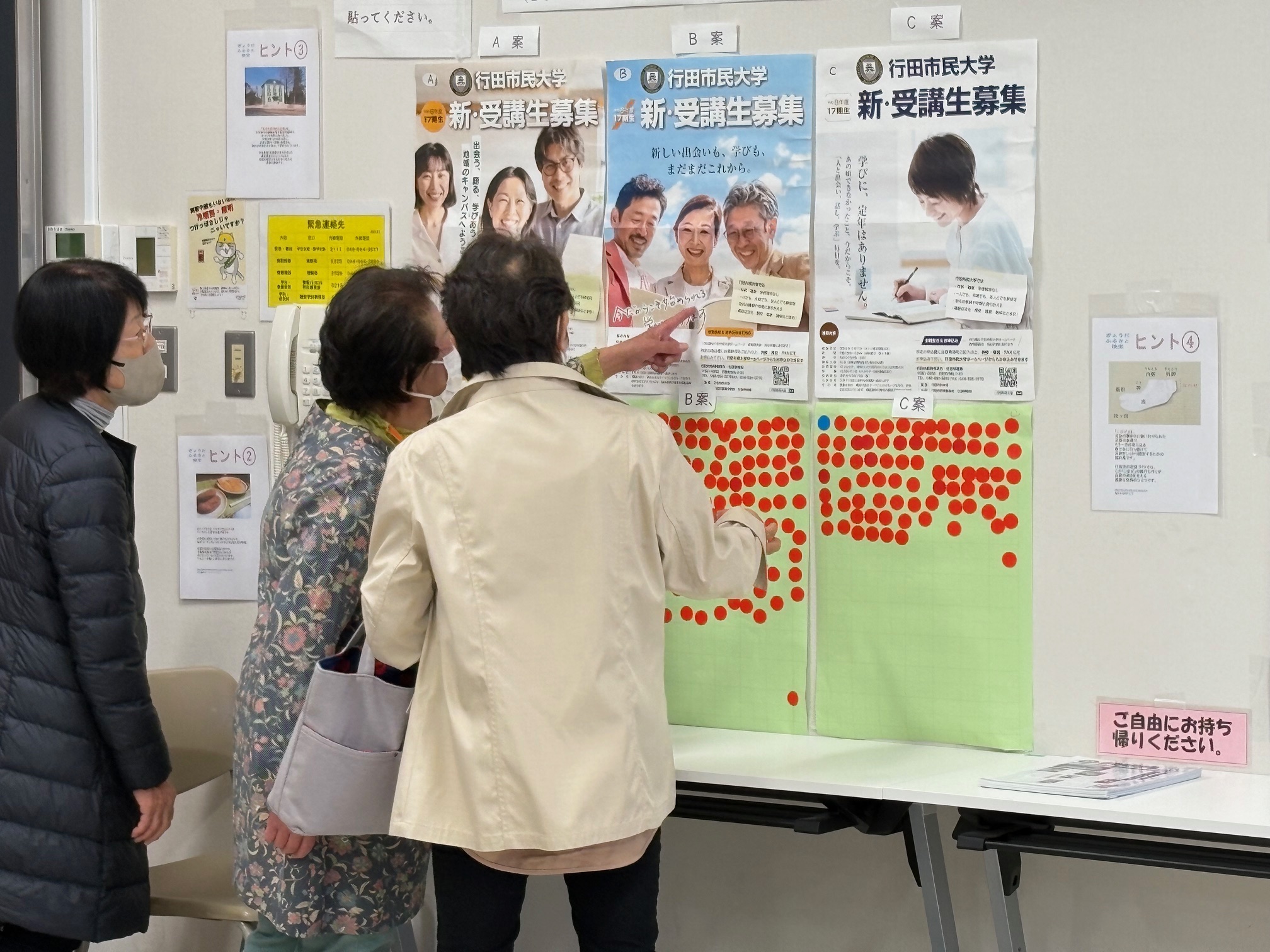 行田市民大学紹介コーナー訪問の記念に来年度の令和8年度受講生募集ポスター3案に対する投票をシール貼付でお願いしました。