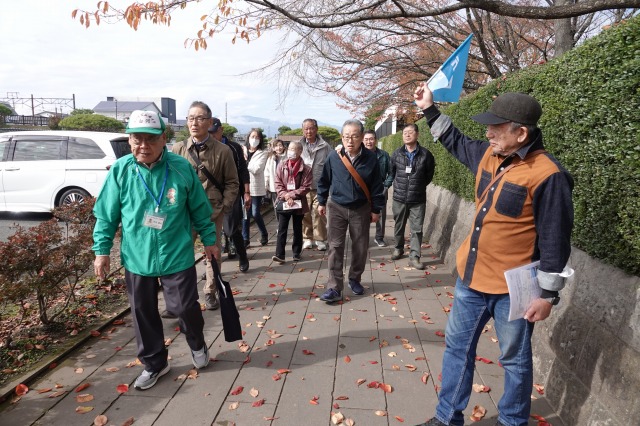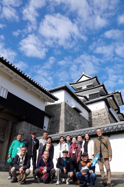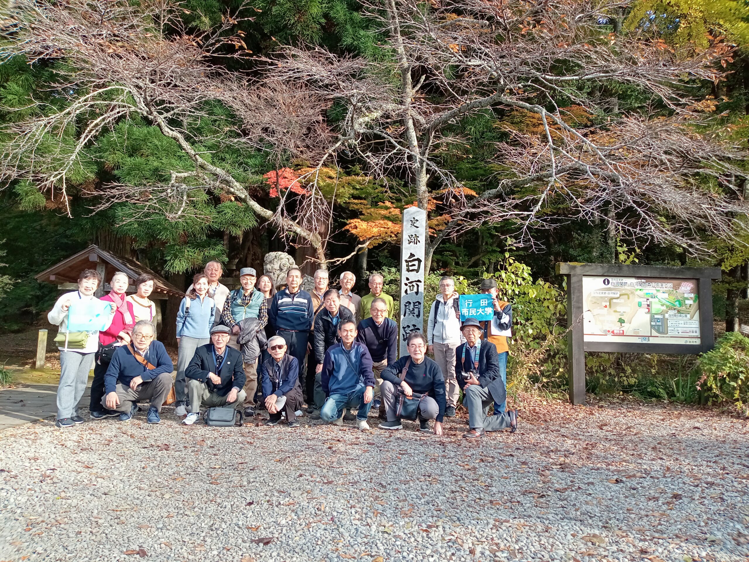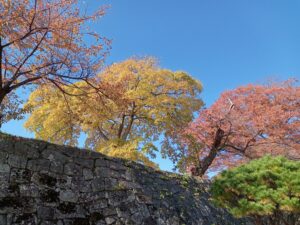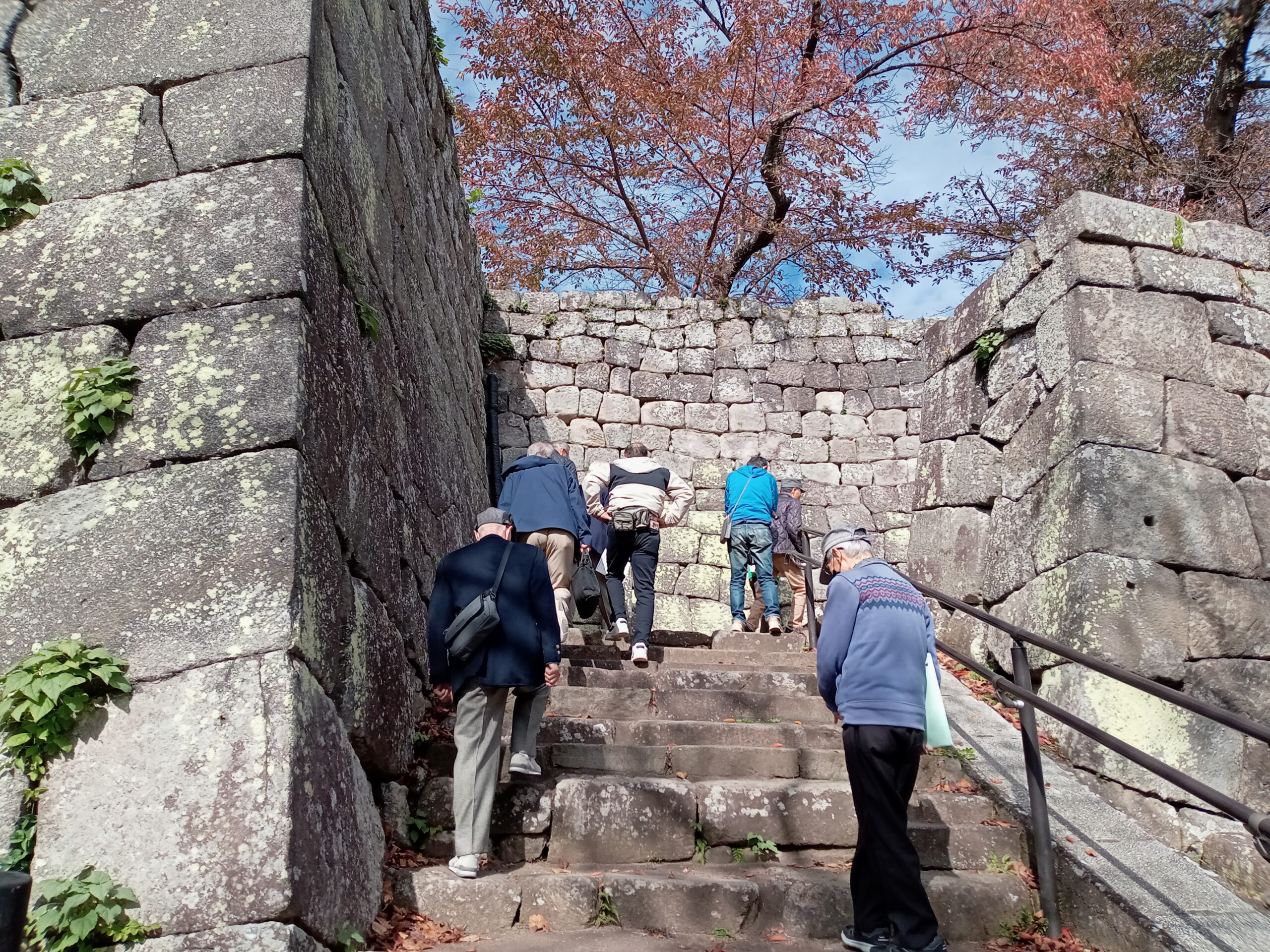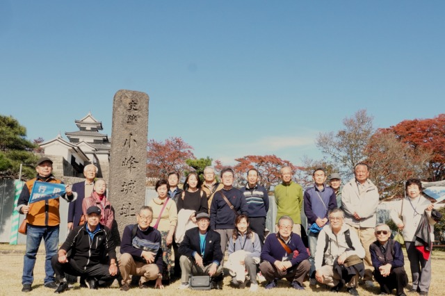 令和7年11月6日(木曜)行田市民大学2年生は、行田市と友好都市の福島県白河市に視察ツアーに行ってきた。雨が予想されてたが、バスで出発するとだんだん雲が取れ、澄み切った青空とイチョウやモミジの紅葉で絵のような風景が現れた。その中に本日の目的地、白河市小峰城の白亜にそびえる天守閣が立派な石垣とともに見事にそびえ浮かびあがった。