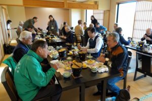 昼食は学生全員で地元の郷土料理を美味しく食べ、帰路の車中では「行田検定」10問を実施、解説。点数を競った。車窓に広がる稲作の景観を見ながら、友好都市白河の歴史と文化を、バスの中で話しながら、帰途についた。