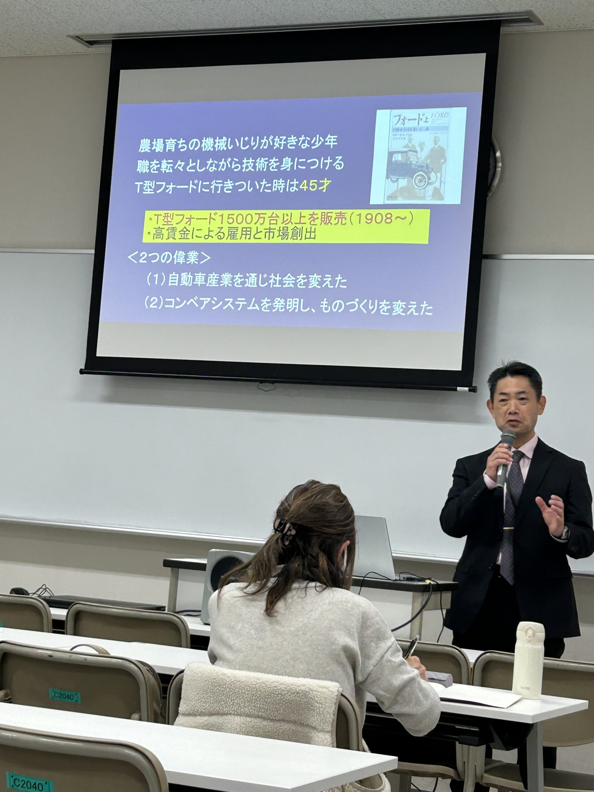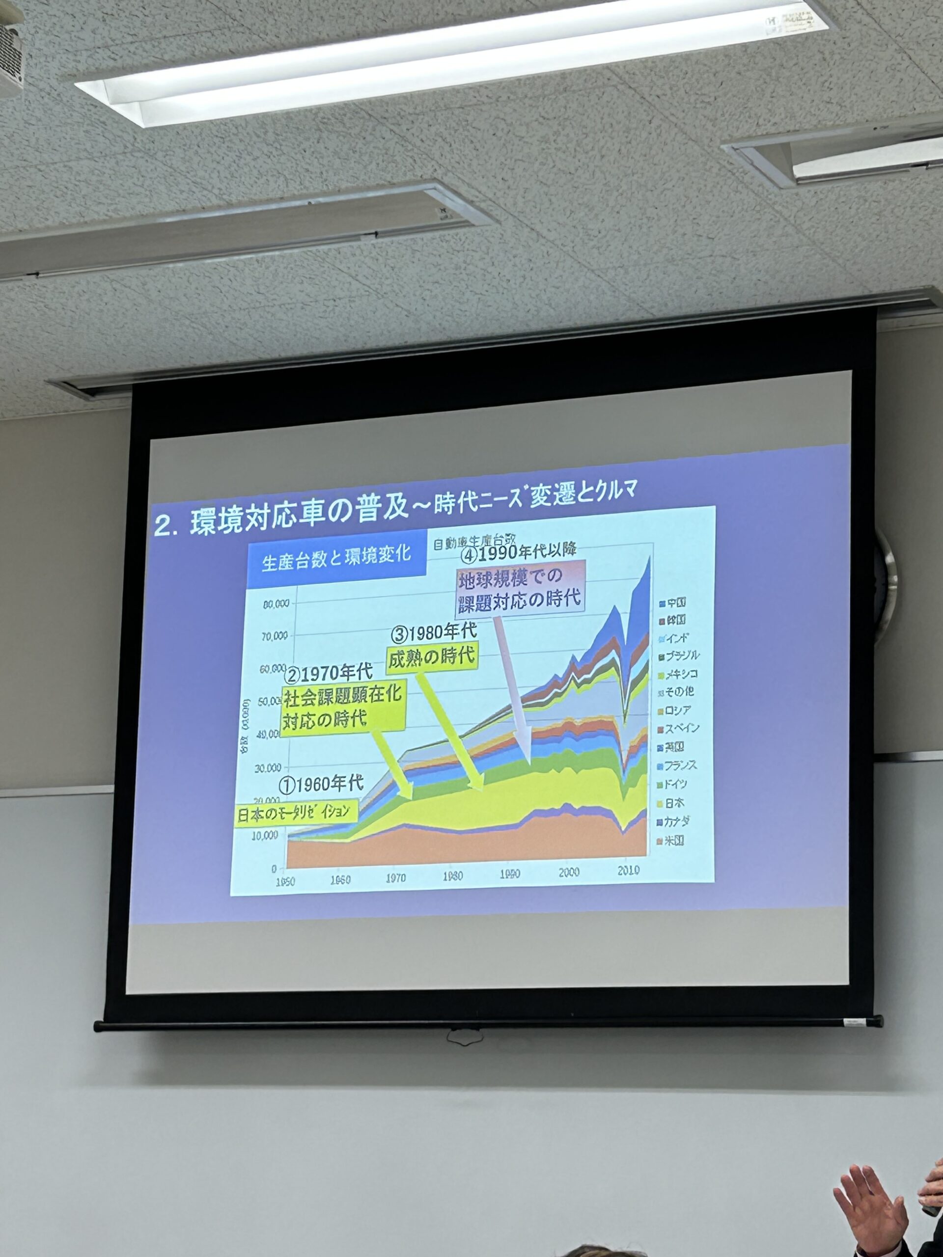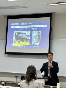 11月20日15期2学年 第15回目の授業が行われました。カリキュラムは、「クルマと社会の過去と未来を覗く」です。講師は、ものづくり大学の小塚高史教授に代わり、荒井豊先生でした。荒井先生のプロフィール紹介、今日の授業の流れがスクリーを観ながら行われました。
