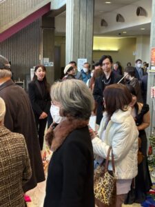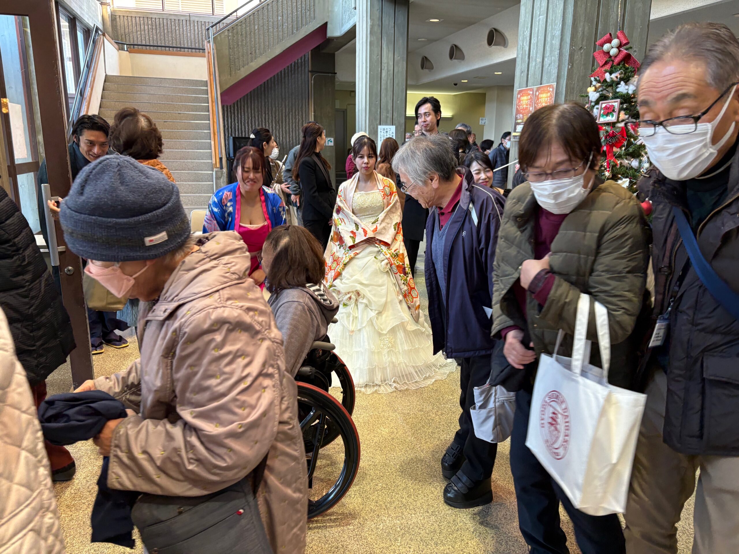 左右に大きなクリスマスツリーがお迎えして受付を終えて開場を待つひとびとがロビーにあふれ、ホールは大勢の来場者を迎えて開演です。