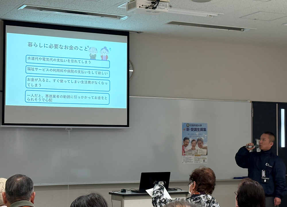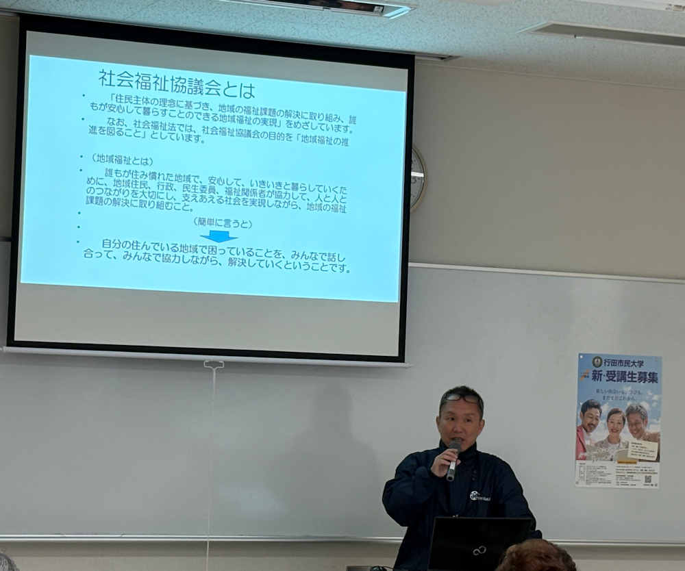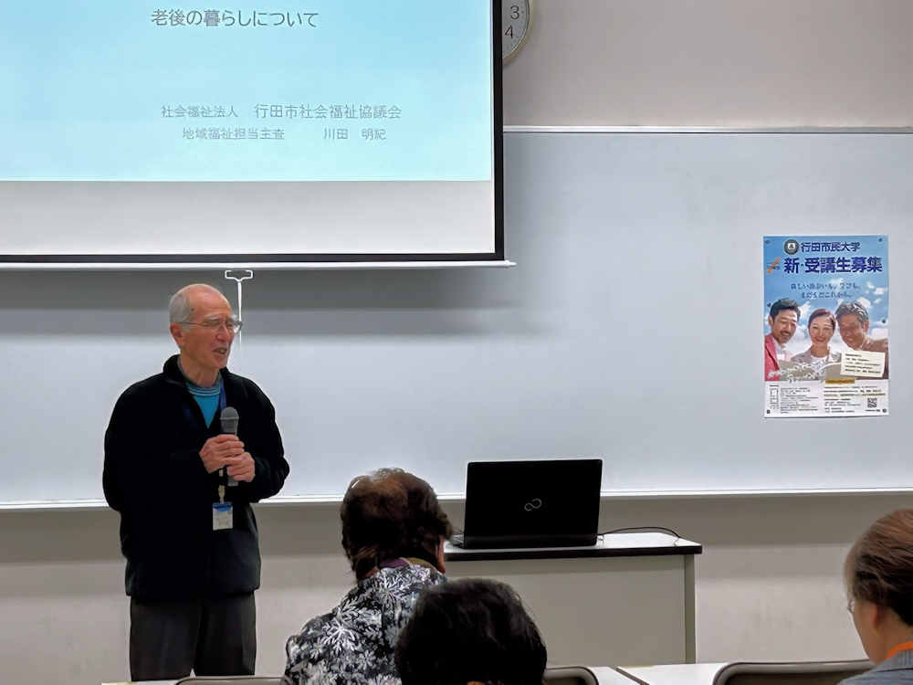 2026年1月9日 / 最終更新日時 : 2026年1月9日 柴田寿彦 市民大学投稿 16期1学年18回講座「老後の暮らしについて」 1月8日16期1学年18回講座は「老後の暮らしについて」を、行田市社会福祉協議会の川田明紀先生を講師に招いて行われました。講義の前に今村武蔵行田市民大学理事長から新年のご挨拶がありました。私の拙い司会進行で始まりましたが、川田先生のユーモアを含めた楽しい講話で、社会福祉の現状や役割など詳しくわかりやすく講義を受けることができました。今後益々増える高齢者に対する問題点など、講義を受けないと気が付かない事があり、貴重な講義を受けれたと思っております。 Follow me!