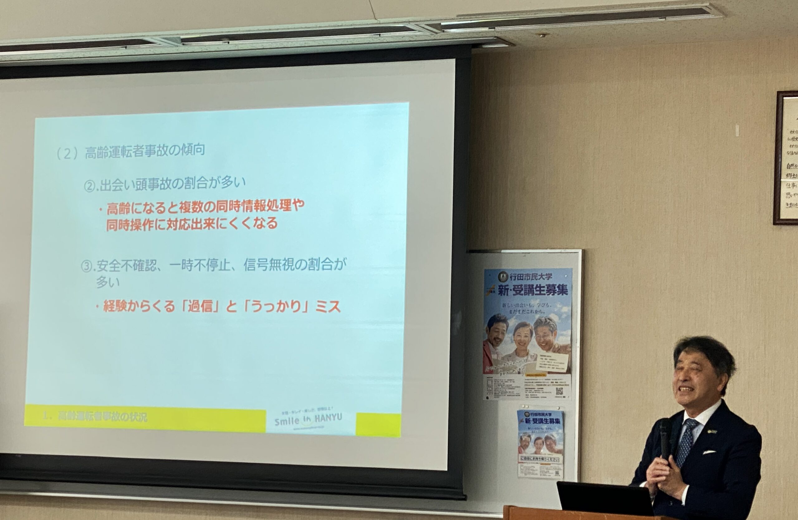交通事故は減少傾向にあるが高齢者の事故は増加しており、埼玉県では46.0%が死亡交通事故にあっているとの厳しい現状を知りました。