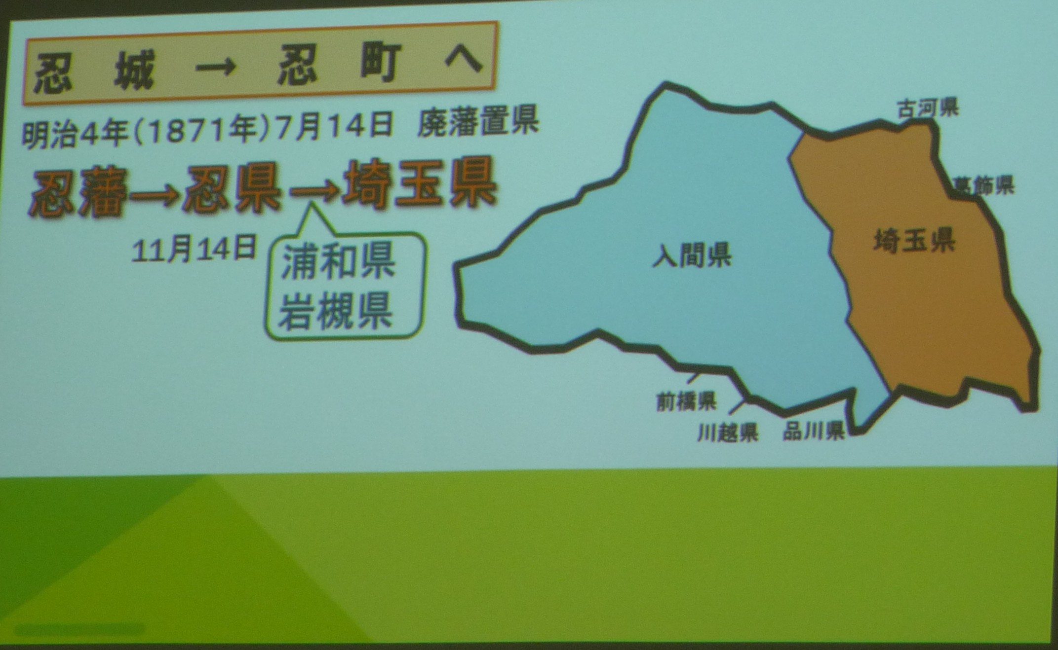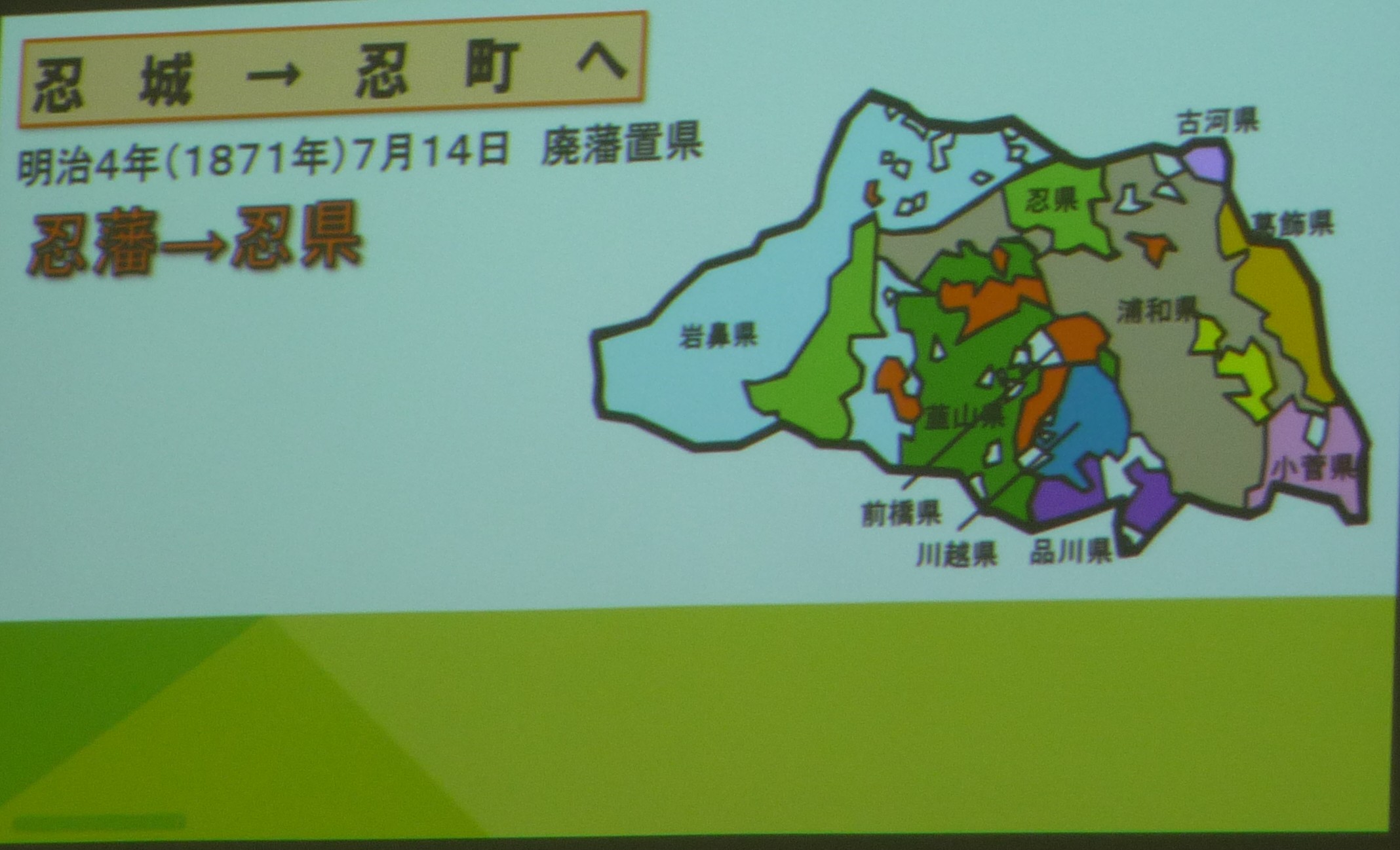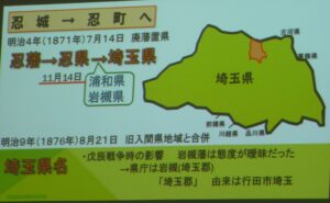 明治4年廃藩置県により忍藩は忍県となる。その後も、合併・離脱をくり返すことにより徐々に今の行田の形へと変わっていった。