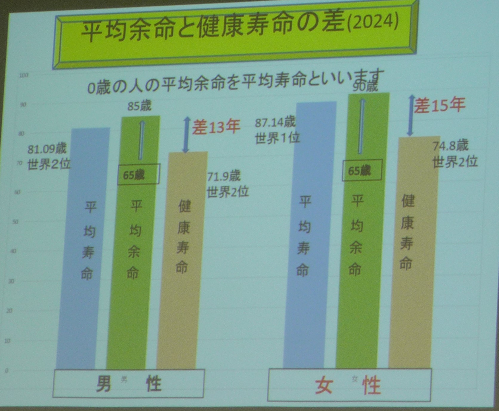 現在、平均寿命は男女ともに伸びましたが健康寿命との差がかなりあるため、その差を減らすためさまざまな活動をすることが良いとされています。