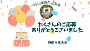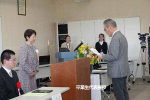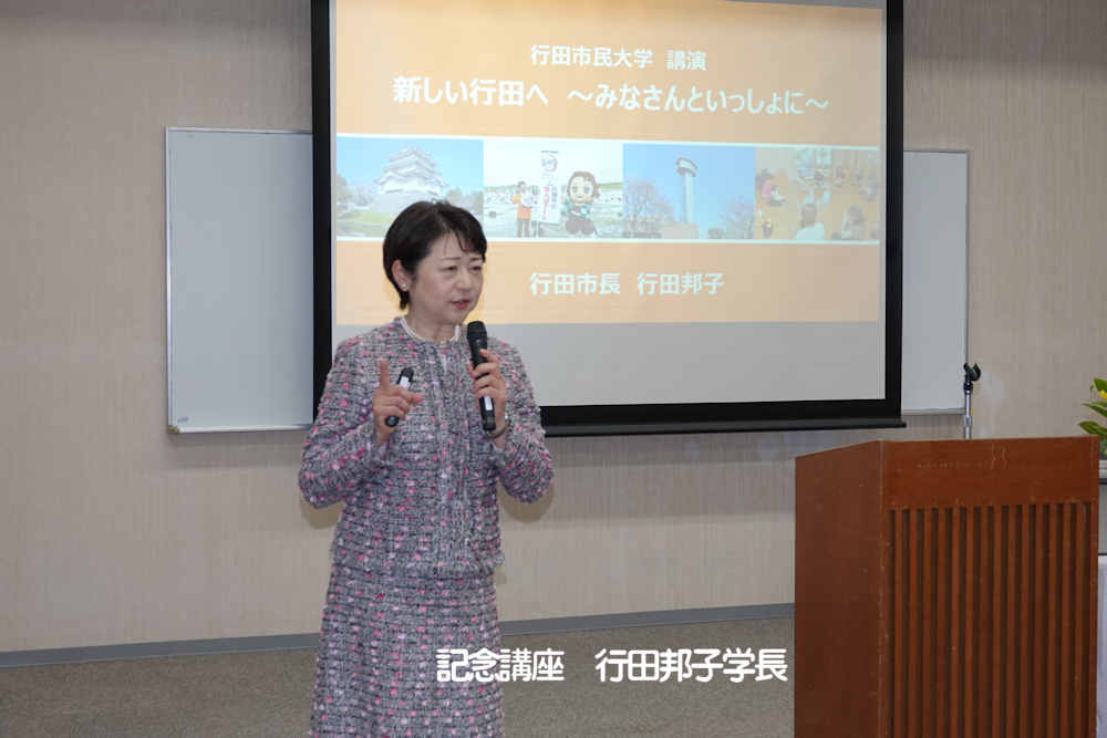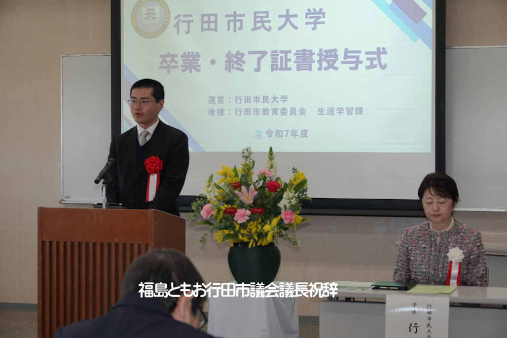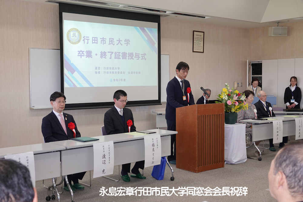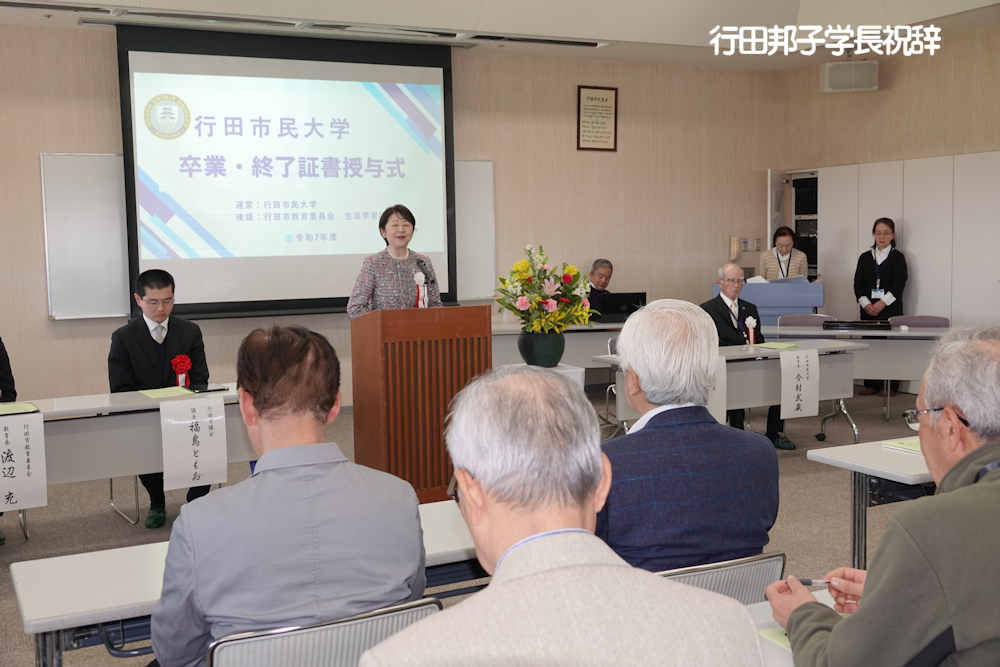 行田市民大学学長 行田邦子氏より祝辞が述べられた。<学んだことを地域社会の主役となって、まちづくりにアイデアを出して、発展を期待している>との励ましのお言葉であった。