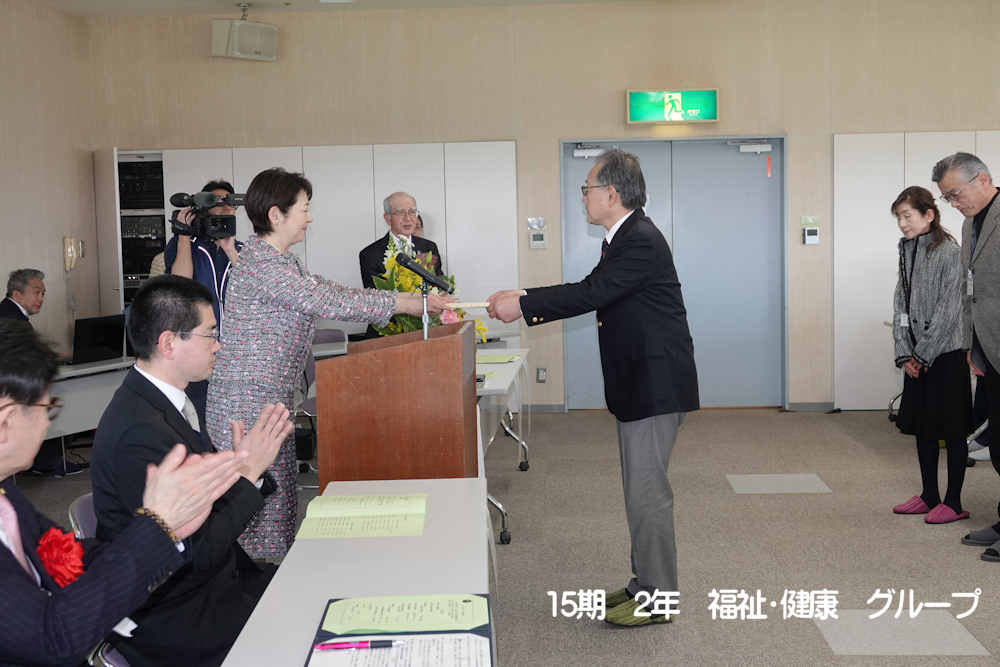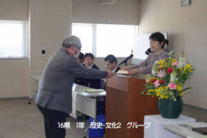 市民大学学長の行田市長 行田邦子氏より、 1学年修了証書授与 16期生1学年5グループ32名。