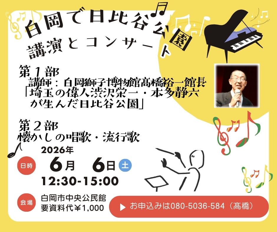 2026年6月6日(土)白岡市中央公民館で「白岡で日比谷公園・講演とコンサート」という催しが行われます。昨年度9月4日の「獅子舞の歴史と伝統」の講師白岡獅子博物館髙橋裕一館長が主催しています。